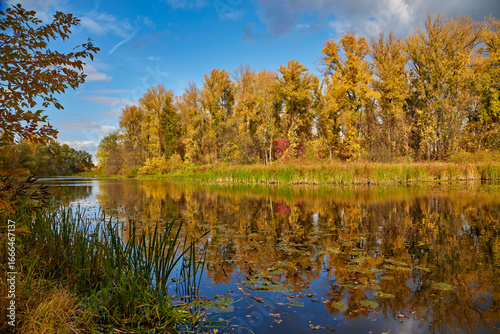 Fototapeta premium Autumn River Landscape with Colorful Reflections