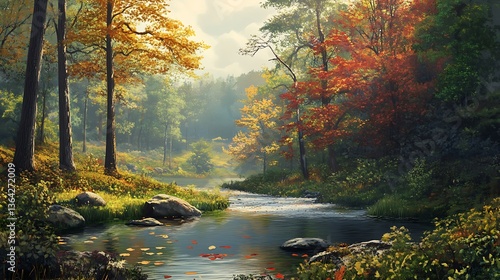 © Infinix, Fototapeta premium Autumn River with Forest Scene.
