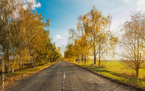 © Victoria Kondysenko, Naklejka premium Autumn road along winter wheat fields
