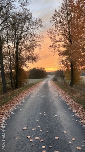 © Suroart, Fototapeta premium Autumn road, fallen leaves, sunset sky.