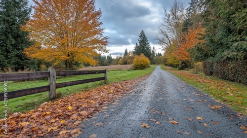 © Fenny, Obraz premium Autumn road, farm, trees, fall leaves, peaceful countryside