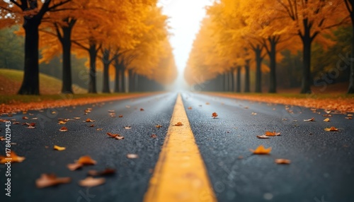 © miss irine, Obraz premium Autumn road illustration with orange trees and fallen leaves. Long asphalt route with yellow line goes to horizon in fog. Scenic journey at fall with warm mood. Nature travel backdrop.