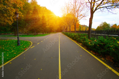 © Alekss, Fototapeta premium Autumn road in colorful park on sunset