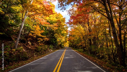 © KMB, Obraz premium Autumn Road Lined with Vibrant Foliage Under a Bright Blue Sky.