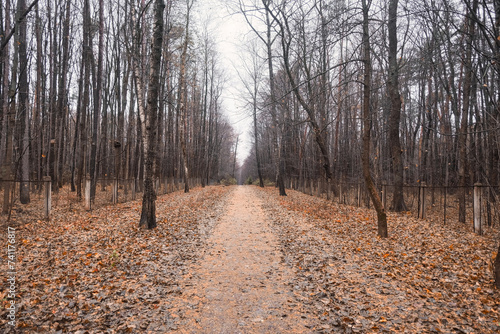 Obraz premium autumn road littered with fallen yellow leaves in a pine forest