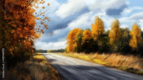 © Vlad, Obraz premium Autumn Road. Scenic Journey through Forest on Empty Highway under the Fall Sky