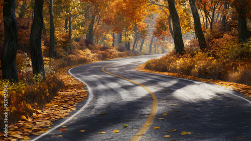 Obraz premium Autumn road through a colorful forest with leaves in shades of yellow,...