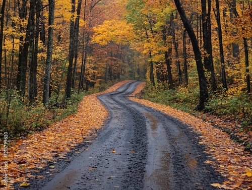Obraz premium Autumn Road Through Golden Forest Scenic Fall Driveway