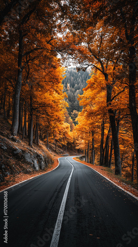 © Nadia, Obraz premium Autumn road through orange forest, autumn phone background, fall mobile wallpaper