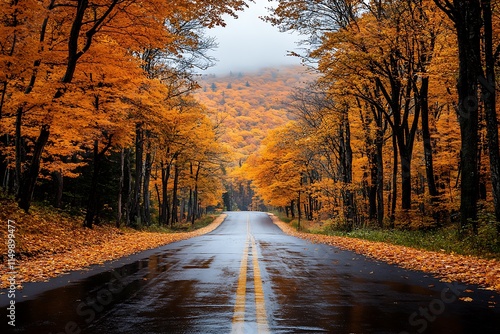 Obraz premium Autumn Road Through Vibrant Golden Foliage Landscape