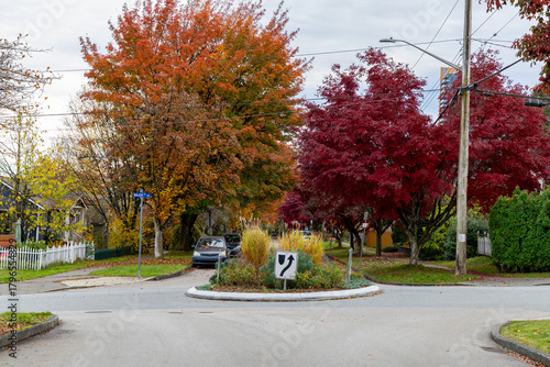 © edb3_16, Obraz premium Autumn Roundabout With Colorful Fall Trees In New Westminster Neighborhood, Greater Vancouver, BC