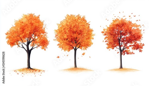 © loongnuad, Naklejka premium Autumn's Embrace: Three trees showcase the vibrant transition of autumn, their leaves turning into fiery shades of orange and red, painted in a captivating illustration.