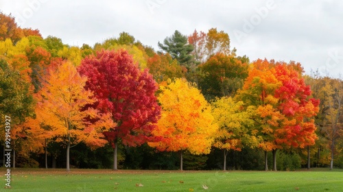 Naklejka premium Autumn's Embrace, vibrant trees draped in rich reds and golds, serene...