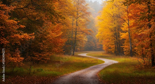 © Thuy, Obraz premium Autumn's Golden Embrace: A Winding Path Through Ember Hues AI Generated