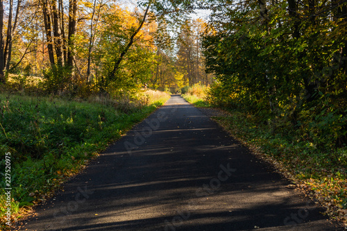 © Roman's portfolio, Fototapeta premium Autumn scene. Fall background. Colorful leaves in park everywhere. Trees and path covered by yellow foliage.