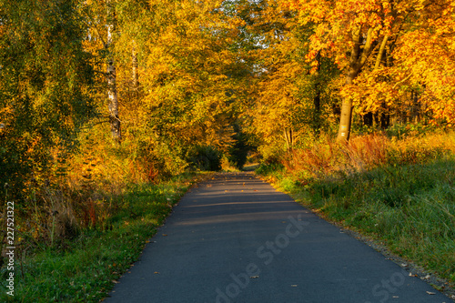 © Roman's portfolio, Fototapeta premium Autumn scene. Fall background. Colorful leaves in park everywhere. Trees and path covered by yellow foliage.