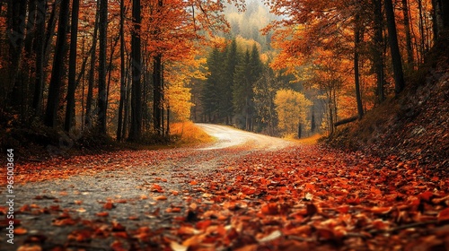 Obraz premium Autumn scene featuring colorful leaves on a road winding through a forest,...