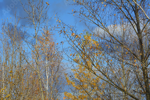 © Happy Dragon, Fototapeta premium Autumn scene in sunny day. Branches of poplar and birch trees with last leaves on the background of grey clouds on the blue sky