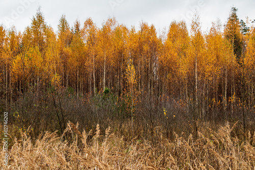 Fototapeta premium Autumn scene with bright yellow birch trees and long wild grass in foreground in autumn