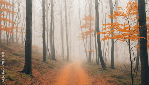 Obraz premium Autumn scene with misty orange forest trees.