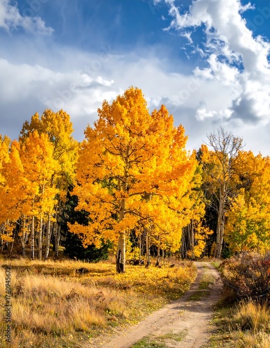 Naklejka premium Autumn scene with vibrant yellow trees lining a dirt road beneath a blue sky