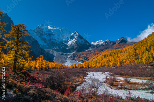 Fototapeta premium Autumn scenery in Yading Nature Reserve, Daocheng county, Ganzi Tibetan Autonomous Prefecture, Sichuan province of China.