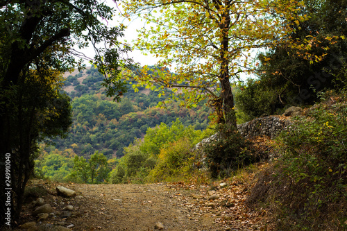 © Artem Kniaz, Naklejka premium autumn season beautiful park outdoor nature landscape space for walking in fresh weather time on ground trail between trees with falling leaves