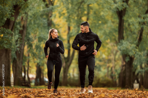 © bnenin, Fototapeta premium Autumn season, running while looking at each other.