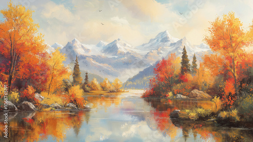 Naklejka premium Autumn Serenity: Majestic mountain reflections in a tranquil lake, surrounded by vibrant fall foliage. A picturesque landscape painting evoking peace and natural beauty.