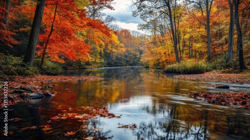 Fototapeta premium Autumn serenity picturesque river flowing through vibrant foliage forest scene