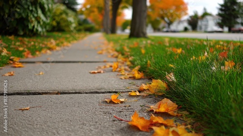 Obraz premium Autumn Sidewalk Scene with Colorful Fallen Leaves and Lush Green Grass in Residential Neighborhood