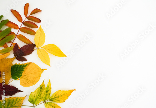 Obraz premium Autumn simple background with a fallen colorful leaves on white background...