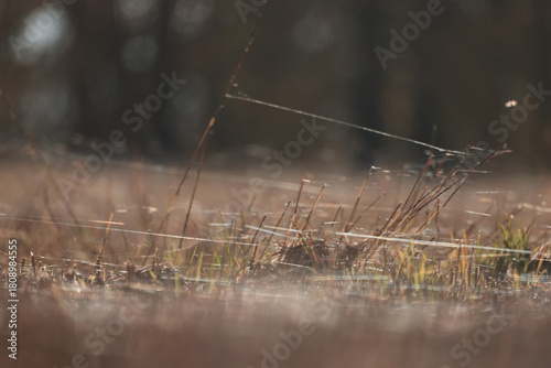 Naklejka premium Autumn spider web flies in the field, abstract background, straw, old grass,...