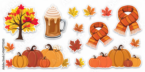 Fototapeta premium Autumn Stickers Pumpkins Tree Scarf Latte Leaves