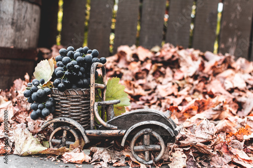 © natalyamatveeva, Fototapeta premium Autumn still life grapes in a wooden car on a background of autumn leaves