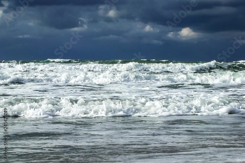 Fototapeta premium Autumn storm. Waves & foam under dramatic sky