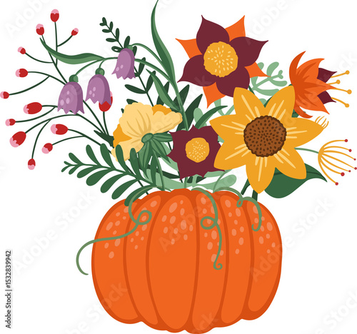 Obraz premium Autumn sunflower display is emerging from flat-style pumpkin on transparent...