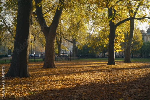 © LyceeChee, Fototapeta premium Autumn Sunlight Illuminates Golden Leaves In A City Park