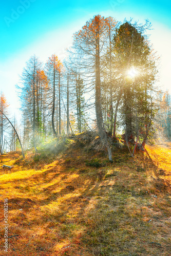 Obraz premium Autumn sunny landscape with pinetrees and larches in mountains