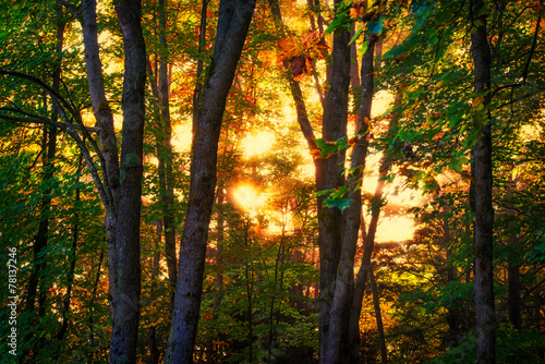 Fototapeta premium Autumn Sunrise Glow Through Trees in a Forest