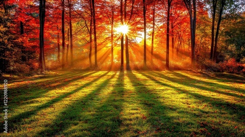 © Biancaart, Fototapeta premium Autumn Sunrise Illuminates Forest Trees and Grass