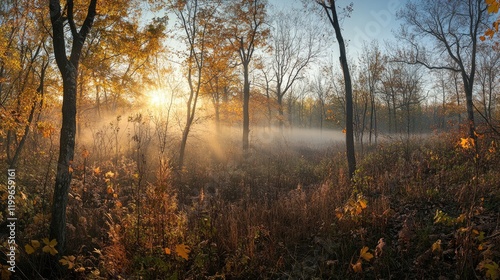 Obraz premium Autumn Sunrise Mist Shrouds Golden Forest Trees