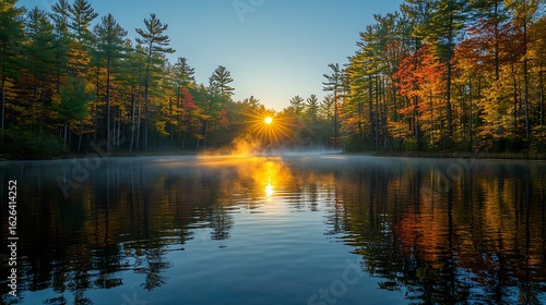 Fototapeta premium Autumn sunrise over a tranquil lake, showcasing vibrant fall foliage...