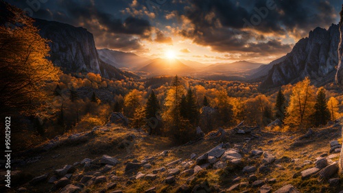 © Temteen, Fototapeta premium Autumn Sunset Mountain Landscape with Golden Foliage