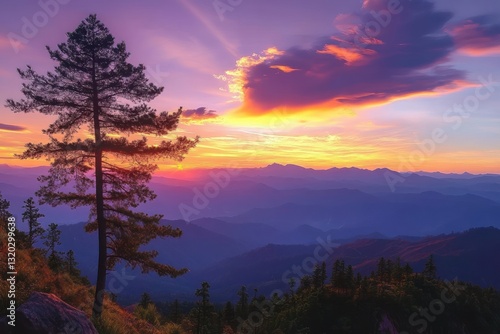 Fototapeta premium Autumn Sunset over Serene Mountain Landscape with Tall Pine Tree and Vibrant...
