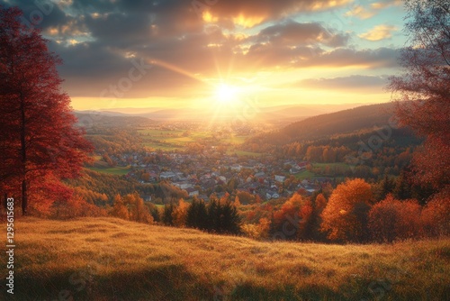 © sangkribo, Fototapeta premium Autumn sunset over valley town