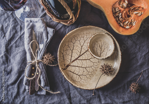 © lblinova, Naklejka premium Autumn table setting with pumpkins. Thanksgiving dinner and autumn decoration.