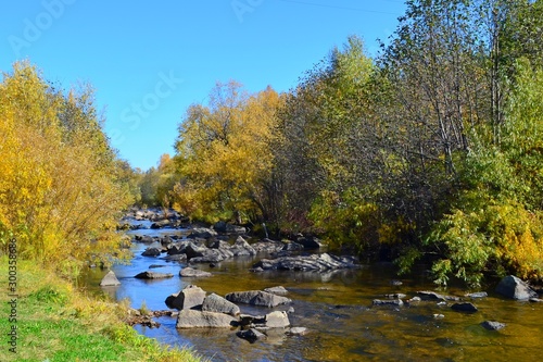 Fototapeta premium Autumn. Taiga river with clear water, boulders and rifts.