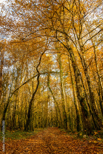 Fototapeta premium Autumn tall trees forest during sunset