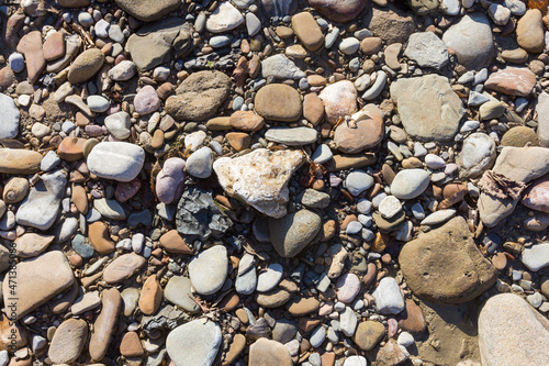 © NAIL BATTALOV, Naklejka premium Autumn, the shallow stone-sandy bottom of a mountain river in the rays of the morning sun, close-up.